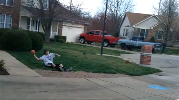 Kevin Fields made a successful basketball shot from 19 feet and eight inches away while seated.