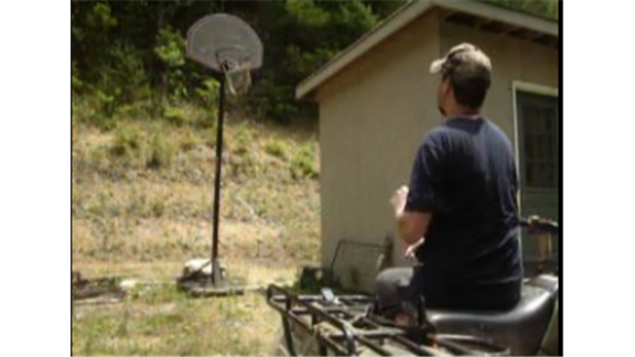 Andy Pelphrey succesfully made seven basketball shots in one minute while sitting sideways in a four-wheeler from 16 feet away.