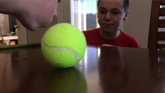 Olivia V. blew three tennis balls into a tennis can in 3.99 seconds.