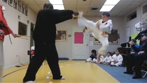 Kevin Taylor's martial arts student broke three boards with jump front kicks.