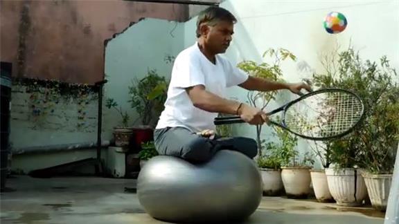 Suresh Gaur bounced a sponge ball on alternating sides of a tennis racquet 32 times while holding a lotus pose on an exercise ball.