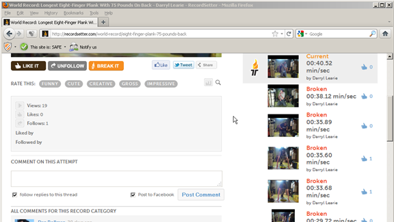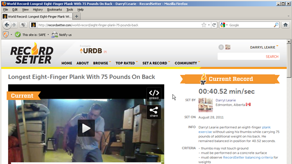Darryl Leariebroke his own record in the record category for "Longest Eight-Finger Plank With 75 Pounds On Back[]" 11 times.