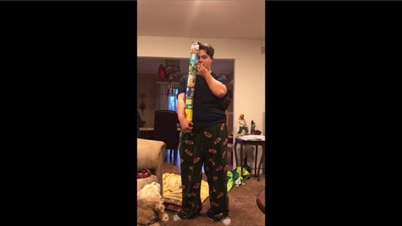 Sam H. held eight cans of food while eating a slice of cheese.