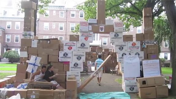 Kirkland House residents at Harvard University used 566 boxes to create a cardboard fort. The structure measured 46 feet, 5 inches by 24 feet, 8 inches, with a height of 15 feet tall at the front towers and 8 to 9 ft. on the other sides.