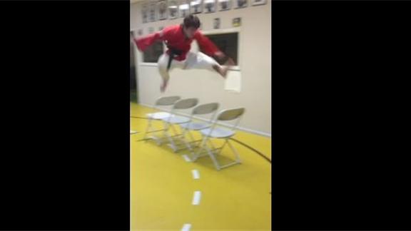 Kevin Taylor's martial arts student, Matt Watts, jumped over four chairs with bare feet.