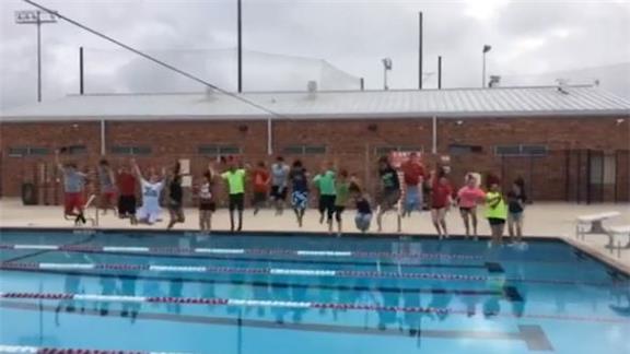 Isaiah and 18 of his friends simultaneously jumped into a swimming pool while wearing their usual clothes.