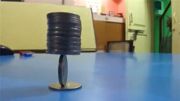 He likely used a magnet under the table. Also note the way this self centered child picks up coins so gruffly while assembling. Vibration from this alone would have caused coin tower to fall.