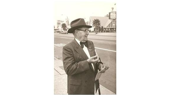 Hoffman bumped into Wingo in Santa Monica, California in 1973, and asked him why he was walking backwards. He discovered Wingo was in the midst of an 8000-mile trek walking backwards. Wingo had small rearview mirrors affixed to his glasses that originally caught Hoffman’s eye.