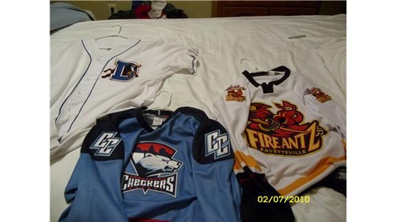 He has jerseys from theDurham Bulls, Charlotte Checkers, and Fayetteville Fireantz.