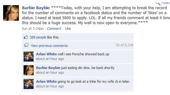 Barbie Baybie and a group of her friends have commented 12,738 times on herFacebookstatus update.