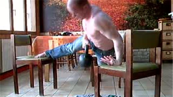 Most Consecutive One-Armed Back-Of-Hand Push-Ups On Three Chairs While Carrying A 20-Kilogram Kettlebell