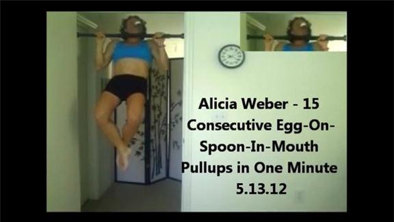 Alicia Weber completed 15 pull-ups in one minute while balancing an egg on a spoon held in her mouth.