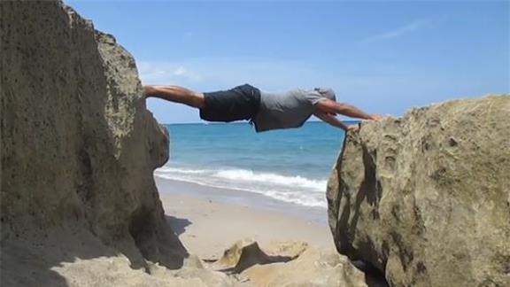 Adel K. performed 36 full extension push-ups while supported between two rocks.