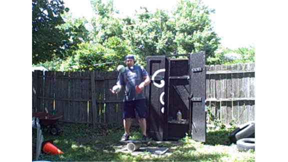 Most Consecutive Golf Ball Bounces On Alternating Sides Of A Paddle While Juggling Two Five-Inch Balls And Standing On A Rola Bola