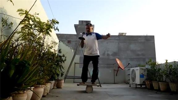 Suresh Gaur bounced a golf ball using alternate sides of a table tennis paddle 79 times while balancing on a rola bola.