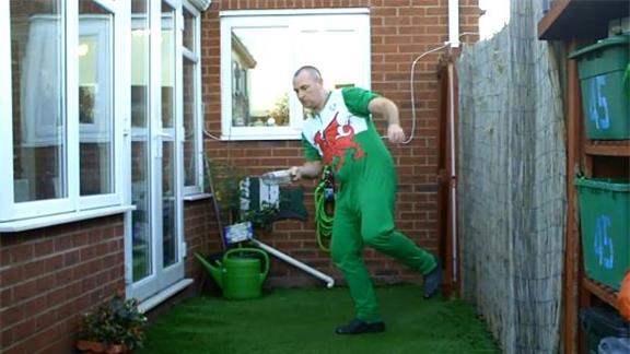 Mark E. bounced a golf ball on a wine bottle 66 times while standing one one leg.
