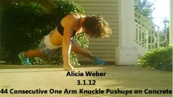 Alicia Weber performed 44 consecutive one-armed push-ups on her knuckles using a concrete surface.