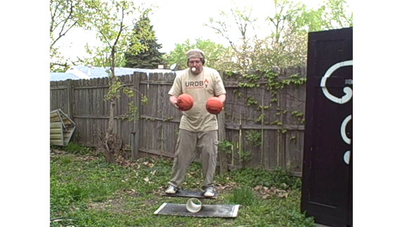 Brian Pankey completed 14 consecutive table tennis ball bounces back and forth between two mini basketballs held in each hand while balanced on a rola bola.