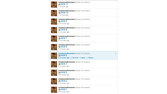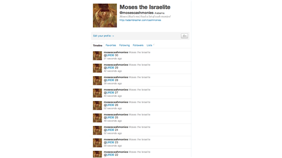 Adam Brasher sent 30 consecutive tweets to @URDB.