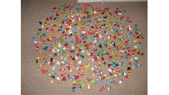 Seb Wescott makes waves in the UK potato chip industry by setting a new world record for the largest collection of homemade crisp packet triangles (445).
