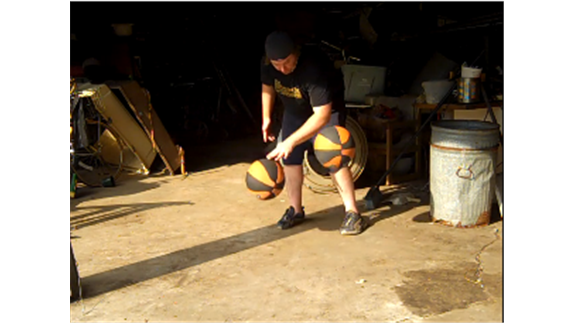 Jess, as a juggler I think that it's very possible. I've bounce-juggled three balls with one hand, but I haven't tried basketballs. Also, the criteria for this allows one bounce between each dribble so it'd be a little easier.