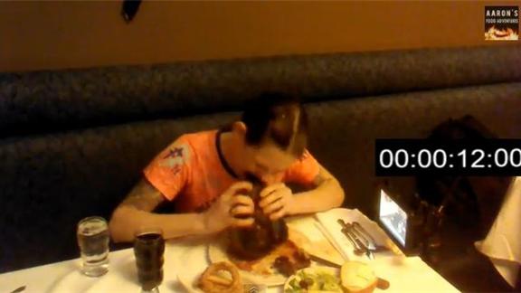 OH MY GAWD. 2 minutes and 44 seconds. Normally people have an hour to finish this steak to compete in the challenge.