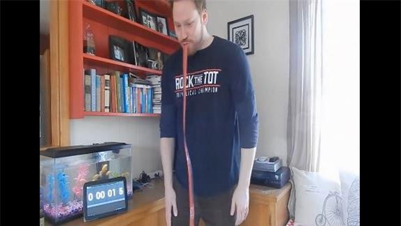 Travis M. ate an unrolled Fruit by the Foot in 14.4 seconds without using his hands.