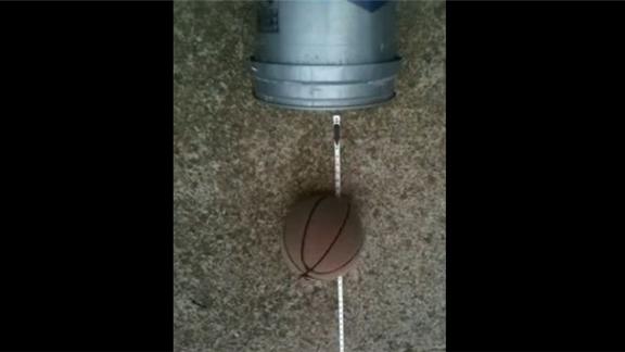 Ty used a golf club to knock a basketball into a bucket from a distance of 11 feet away.
