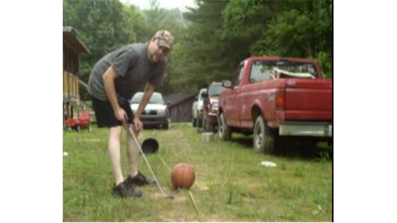 Andy Pelphrey used a golf club to knock a basketball into a bucket from a distance of 10 feet (120 inches) away.