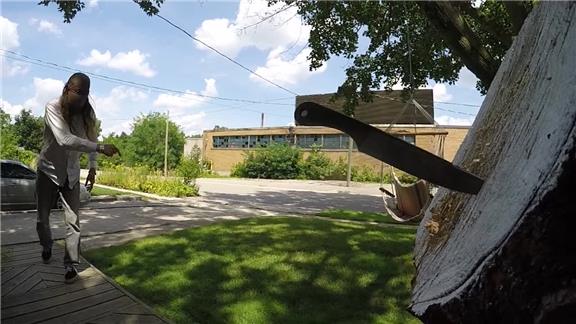Mad Gyver simultaneously threw a Tic Tac hard mint and a knife at a target eight feet away while blindfolded.