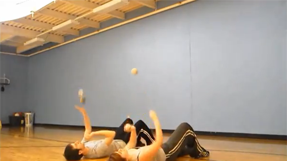 Pete Moyer and Jillian Roach juggled three balls while lying on their backs for 11.88 seconds.