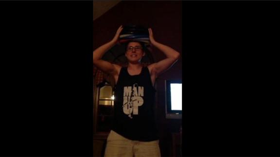 Zachary S. balanced eight frisbees on his head.