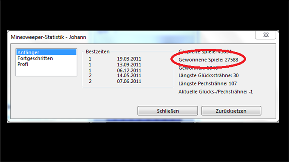 Johann Kuchta won 27,588 games on the beginner level of Minesweeper for Windows 7.