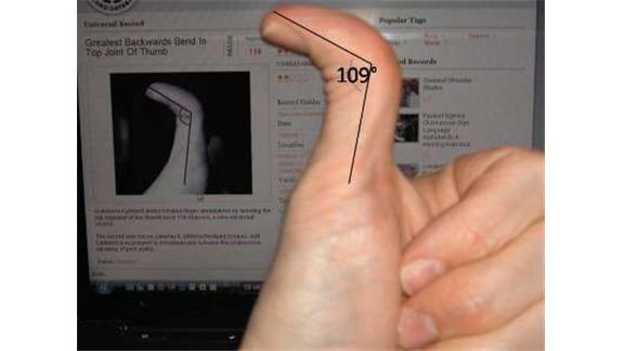 Eric Weisman raised the bar in the ‘Greatest Backward Bend In Top Joint Of Thumb’ category by bending his thumb back 109 degrees, seven degrees more than previous record holder Guinevere Cuthbert.