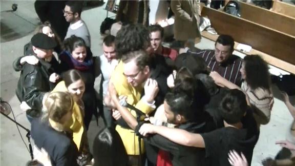 A total of 62 people from powerHouse Books joined together for a group hug during a stop on the RecordSetter book tour.