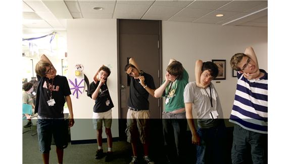Students from iD Tech Camp -Vassar College wrapped their right arms behind the head and under the chin in order to touch their ear on the same side.