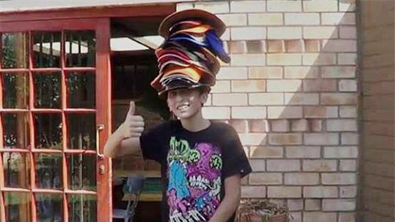 Brendan B. wore 30 hats while riding a unicycle.