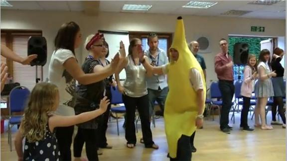 Alex Clayton exchanged high fives with 116 people in one minute while wearing a banana costume.