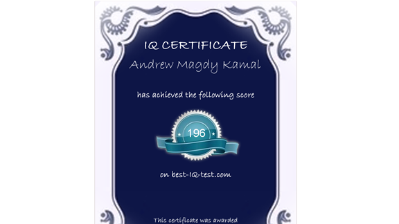 Fifteen-year-old Andrew Magdy Kamal achieved an IQ of 196 on Best IQ Test.