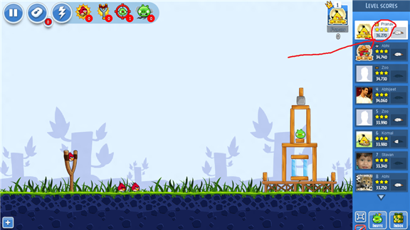 Pranav Tank earned 36,270 points on level 1-1 of Angry Birds-Poached Eggs.