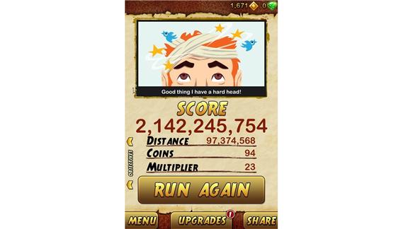 Zackary M. earned 2,142,245,754 points in Temple Run 2.