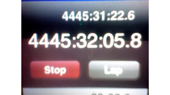 John Paul Dib has logged 4,452 hours, 32 minutes and 5.8 seconds on his iPod stopwatch. The record continues to grow.