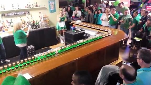 MacKenzie M. built a domino chain using 157 Irish Car Bomb cocktails and successfully made the entire chain topple.