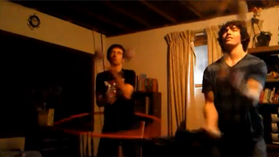 Pete Moyer hula hooped and juggled three two-pound balls in a Mills Mess pattern simultaneously for 8.51 seconds while Spencer Renfro juggled four balls.
