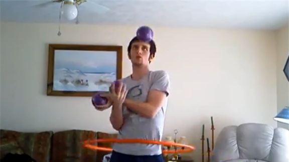 Pete Moyer juggled three two-pound balls in a Mills Mess pattern for 59.79 seconds while hula hooping.