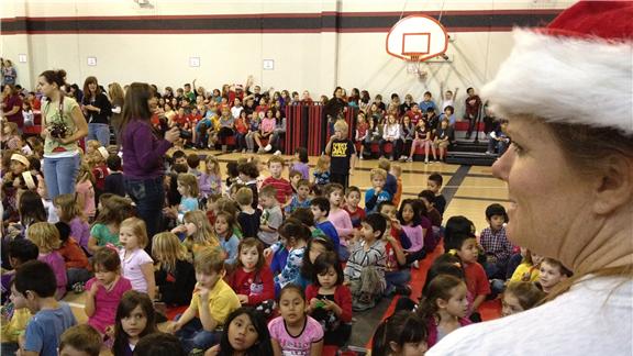 Principal Karen Miller-Kopp of Lake Travis Elementary School led 858 people in playing Jingle Bells on kazoos.