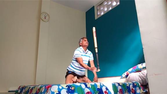 Suresh Gaur performed a knee stand with pinky finger support for one minute, 2.59 seconds while holding a lotus pose and balancing a baseball bat on his other pinky finger.