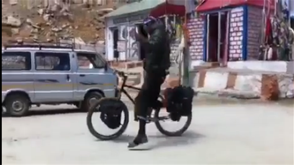 The trick is to get off the bike smoothly so that it rolls straight, do a little dance, and hop back on. My friends and I were on a bicycle camping trip.
