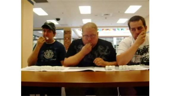Glenn Jones, Craig Wilson and Steve Olshefski put a combined total of 39 marshmallows in their open mouths.