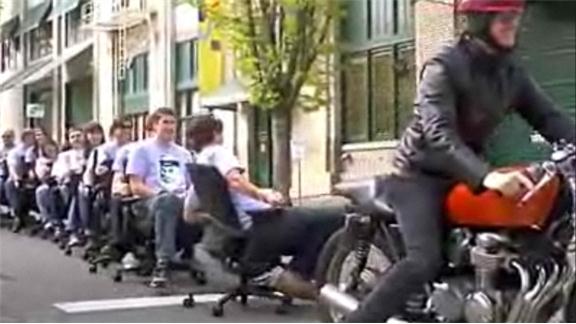 19 members of Wieden Kennedy’s Team Maroon formed a train of office chairs and were pulled down the street behind a motorcycle. The team originally had 18 members, but randomly bumped into NFL quarterback Joey Harrington at Sherman Clay Pianos and convinced him to join their record attempt.